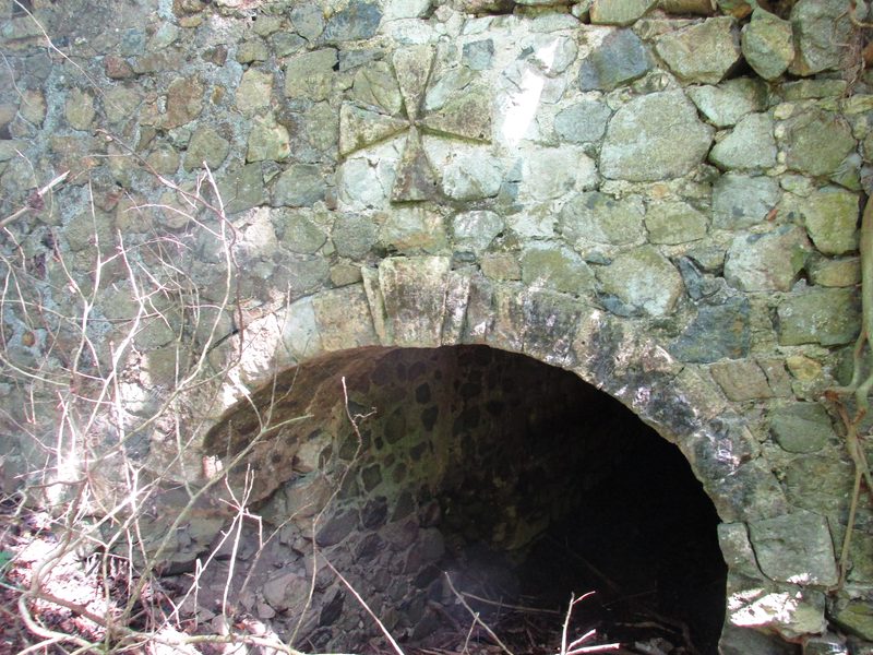 The most direct approach to the mountain was to go north and cross over a low point in the ridge to the west of the hill and then approach the hill traveling towards the east. Along this route is a bridge with an arch made of precision cut stone held in place by a keystone so there is minimal mortar in this load bearing arch. Right above the keystone is a Maltese Cross built into the stone work. The stone of the Maltese Cross is sandstone probably mined along the west coast of St. Croix.