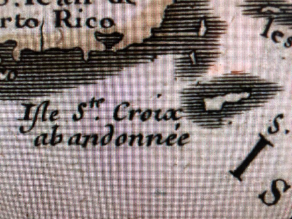 On the Map from JP, the French possession of St. Croix is described as “Isle Sainte Croix abandonnée,” which declared the island as an abandoned or deserted place. As pointed out by Arnold Highfield in his many books, the French Navy under Louis XIV enforced the French right to their possession by occasional raids to purge the island of wood cutters and squatters, which were the only residents they ever found on the island.